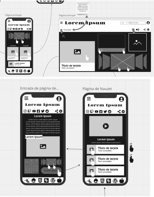 Tras definir el diseño en papel, el siguiente paso fue digitalizarlo en Miro. Esta plataforma ofrece herramientas fáciles de manejar para construir wireframes de manera rápida y organizada. Utilicé las plantillas de teléfono, Tablet y página web que posee la página y líneas para representar las distintas secciones de la página, asegurándome de respetar la estructura planteada en mis bocetos.